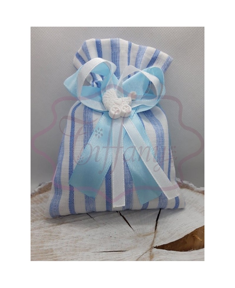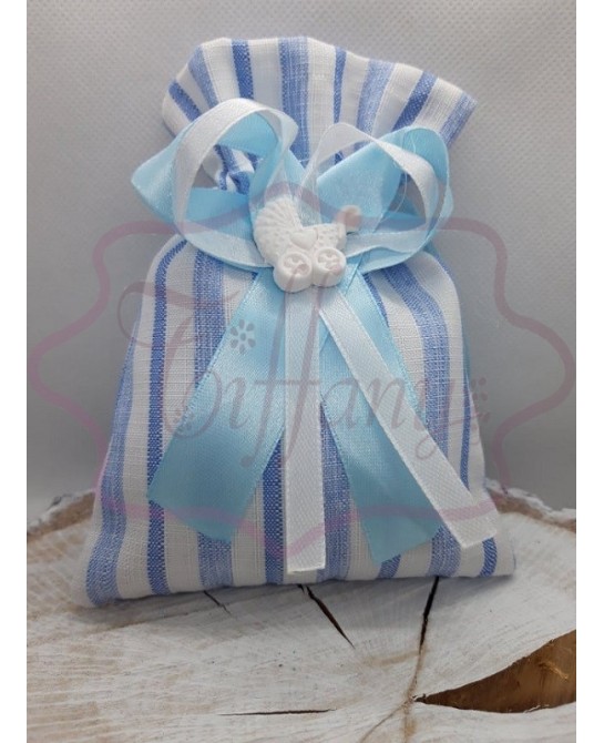 Sacchetto portaconfetti celeste in tessuto con righe più gessetto.