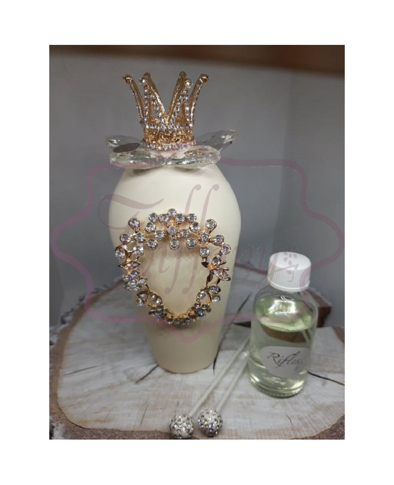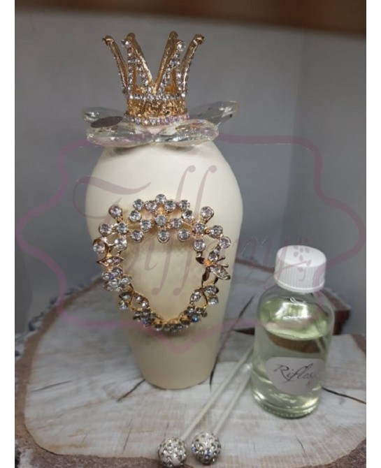 Profumatore alto avorio in porcellana , applicazione in metallo oro con strass,fiore in cristallo e corona re oro.