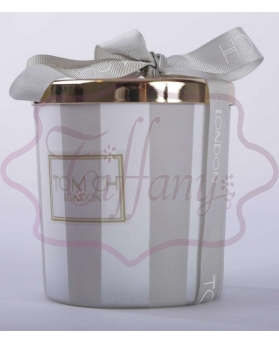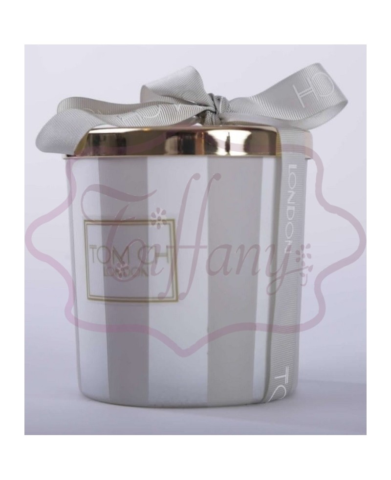 Elegante candela in vetro a strisce all' aroma di vaniglia, dotata di coperchio per spegnere la fiamma e per proteggerla dalla polvere.