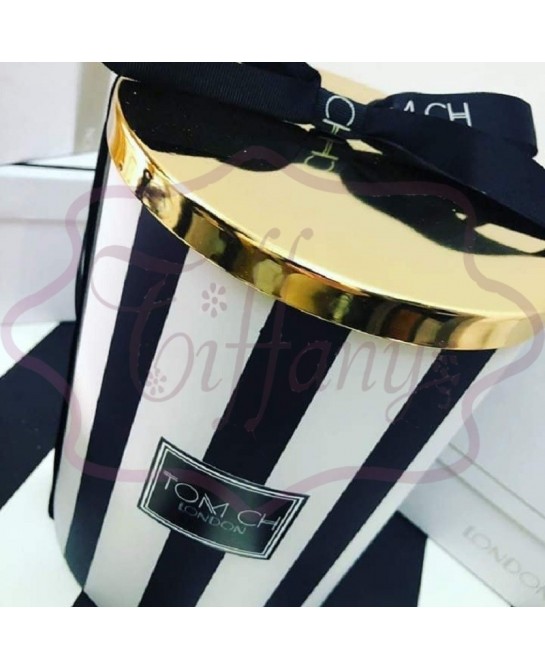 Elegante candela in vetro a strisce all' aroma di vaniglia, dotata di coperchio per spegnere la fiamma e per proteggerla dalla polvere.