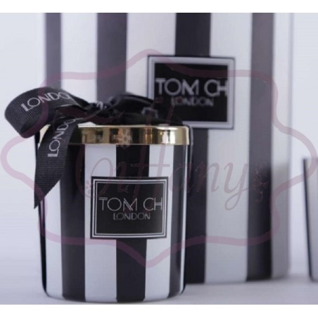 Elegante candela in vetro a strisce all' aroma di vaniglia, dotata di coperchio per spegnere la fiamma e per proteggerla dalla polvere.