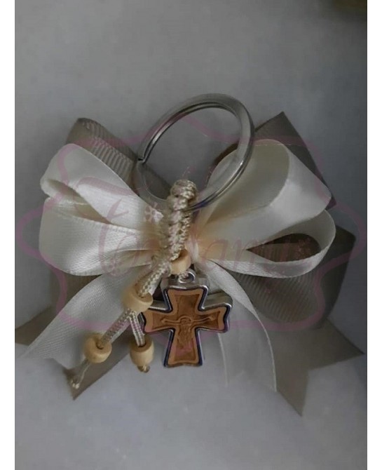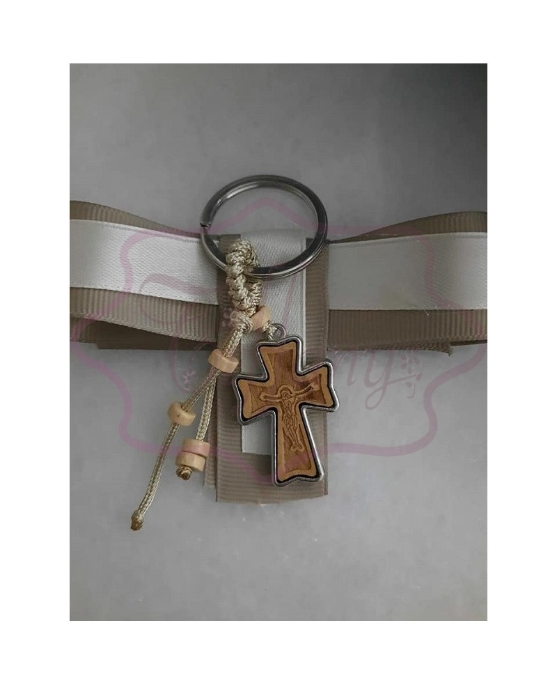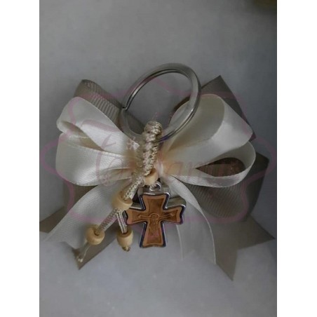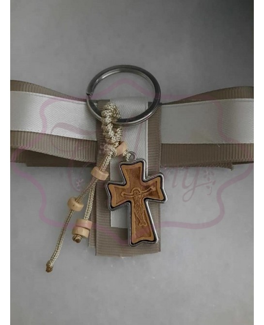 Croce portachiavi in legno e metallo per battesimo, cresima e prima comunione.